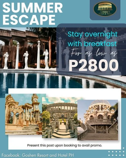 Goshen Resort & Hotel is a one-of-a-kind destination in Bamban, Tarlac, known for its Roman-inspired architecture, scenic landscapes, and peaceful atmosphere. Whether you’re here for a relaxing getaway, a memorable day tour, or a special celebration, Goshen offers an experience unlike any other.